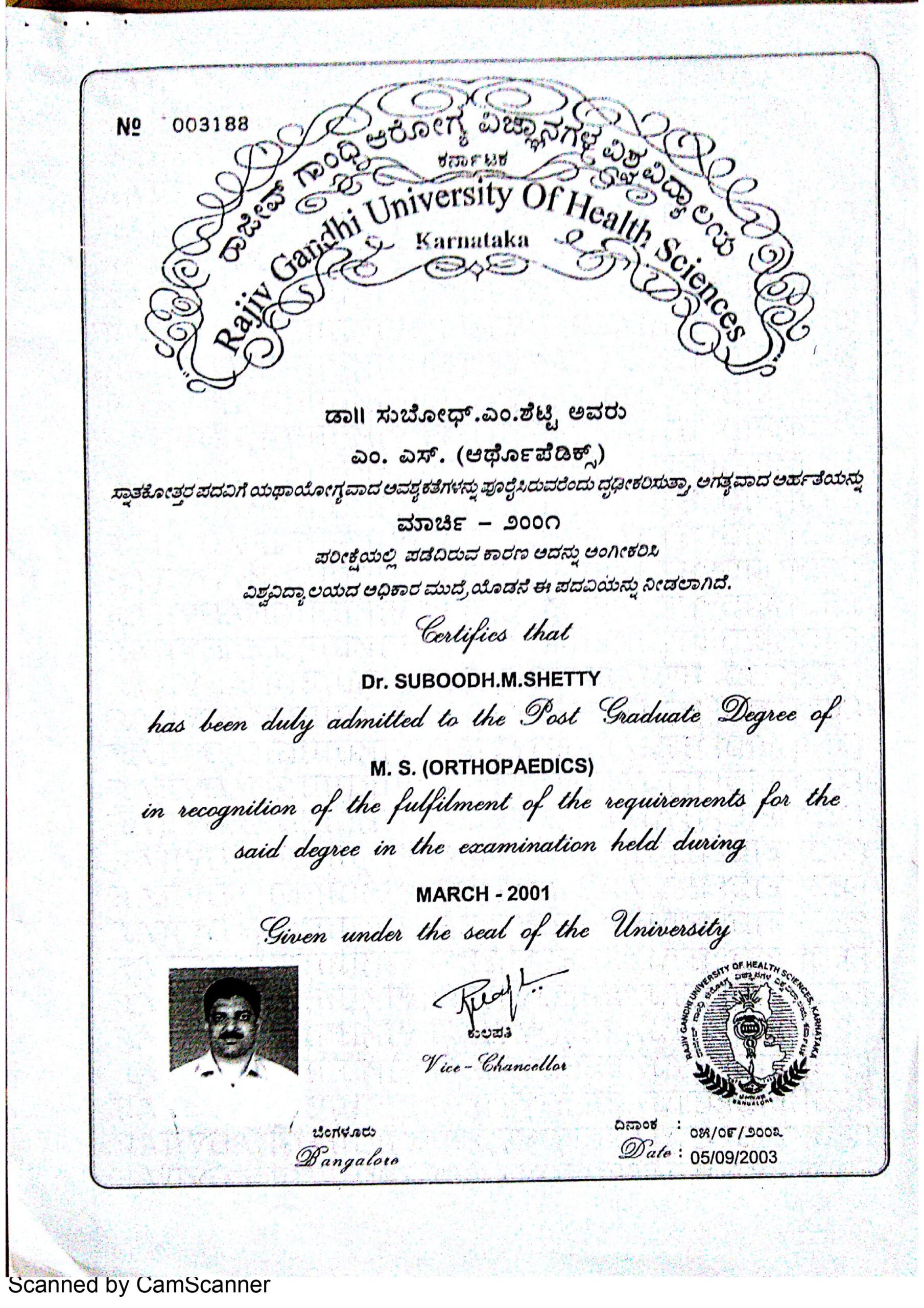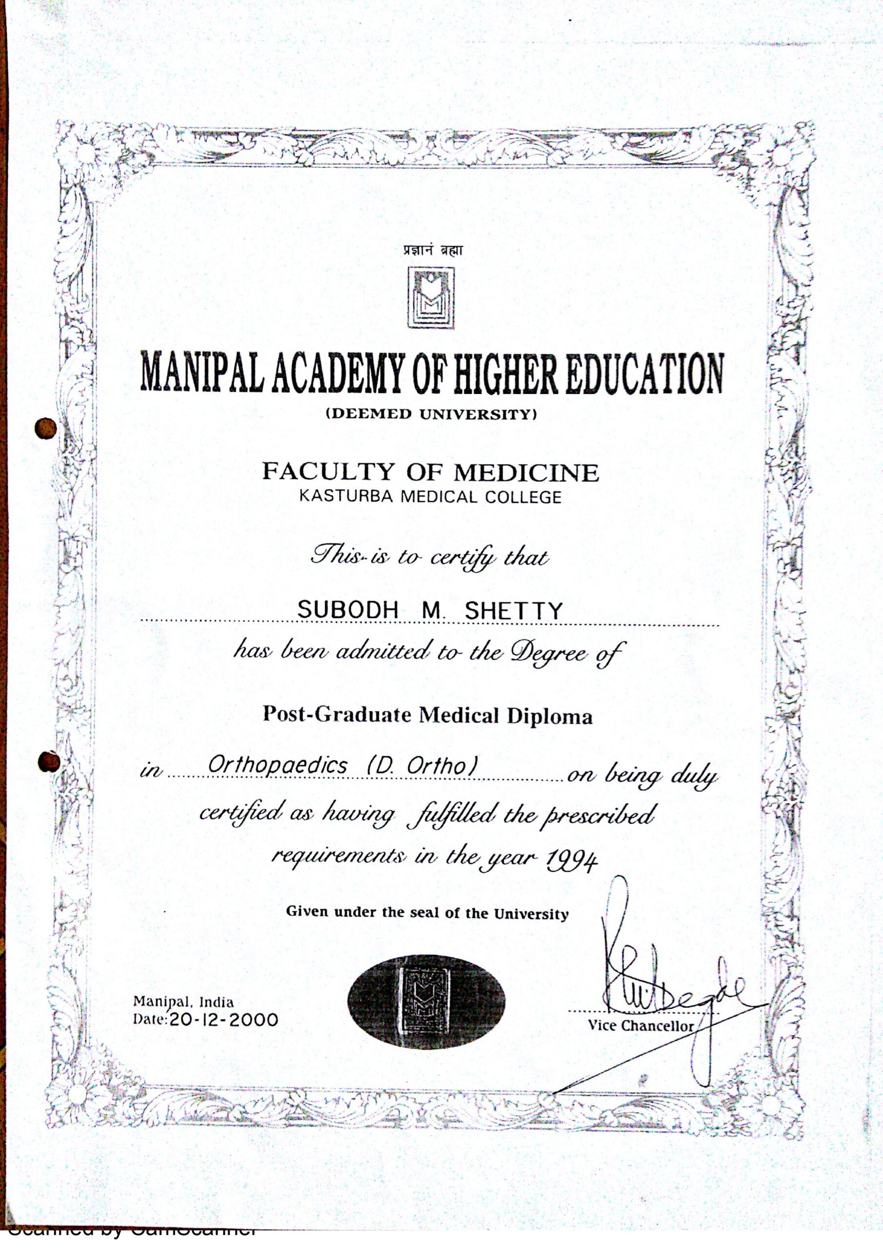 Dr. Shetty’s passion for excellence has driven him to become a highly accomplished orthopedic surgeon. He pursued further expertise by completing his Master’s in Orthopedic training at Jawaharlal Nehru Medical College (KLE University) and gained invaluable experience as a registrar under Prof. Shantaram Shetty at the Shantaram Shetty Institute of Orthopaedics and Traumatology (Mangalore).